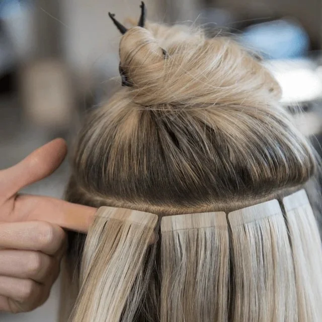 Tape-in extensions a thin extension strips that are affixed by sandwiching your natural hair between two adhesive tabs. They are lightweight and comfortable, providing a natural feel that allows you to go about your daily activities without any hassle. Our tape-ins provide a seamless blend, giving you the voluminous and glamorous hair you've always dreamed of. Designed to last, these extensions can be comfortably worn for up to 8 weeks, allowing you to enjoy long-lasting transformation. One of the key benefits of our tape-in extensions is their reusability. You can reuse these extensions up to three times, making them a cost-effective choice without compromising on quality. Installations for hair purchased outside of the salon are subject to a $30 additonal cost per pack (10 sandwiches).